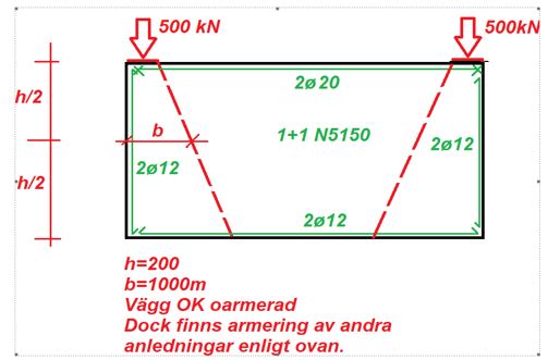 Illustrerar med ett exempel enligt nedan, där det ligger armering i väggen av andra anledningar än den med hänsyn till bärförmåga för väggen, exempelvis för ingjutningsgods eller för att förhindra krymp och krypsprickor. Överst ligger dock en armering för att förhindra hörnspjälkning på grund av punktlasten.
