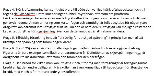Fråga: Min fråga gäller tvärkraftsbrottmoden hävstångsbrott i betong, kapitel 7.2.2.4. För brottmoderna betongkonsbrott (7.21.4) och betongkantbrott (7.2.2.5) ges möjlighet att höja bärförmågan genom att lägga in kompletterande armering. Kontroll av betongen utgår då och ersätts av kontroller av den kompletterande armeringen. Ingen sådan möjlighet att armera mot brottmoden verkar finnas för hävstångsbrott i betong. Bärförmågan reduceras i stället vid förekomst av armering. Dels genom faktorn 0,75 i ekvation 7.39b vid förekomst av kompletterande armering och dels möjligen vid förekomst av ytarmering genom faktorn Ψre,N i beräkningen av NRk,c. Är detta rätt uppfattat? Och är det i så fall inte märkligt att bärförmågan med hänsyn till hävstångsbrott i betong beror av bärförmågan med hänsyn till betongkonsbrott, men att armering som i praktiken höjer bärförmågan med hänsyn till betongkonsbrott sänker bärförmågan med hänsyn till hävstångsbrott i betong? Är det möjligt att NRk,c.i ekv. 7.39b egentligen skulle ersättas med en bärförmåga relaterad till den kompletterande armeringen? Borde inte armering rätvinkligt mot ytan höja bärförmågan? Den höjer ju i praktiken bärförmågan med hänsyn till betongkonsbrott, och bärförmågan med hänsyn till hävstångsbrott i betong är ju beroende av denna.
