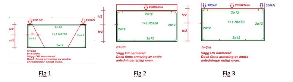 Illustrerar med tre exempel enligt nedan, där det ligger armering i väggen av andra anledningar än den med hänsyn till bärförmåga för väggen, exempelvis för ingjutningsgods eller för att förhindra krymp och krypsprickor. Överst ligger dock en armering för att förhindra hörnspjälkning på grund av punktlasten.